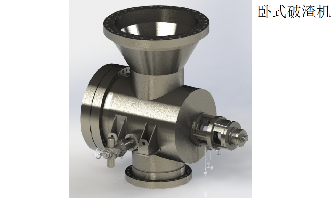 破渣機(jī)殼體為壓力容器,其核心部件動(dòng)齒和靜齒偏心地安裝在殼體上,二者做相對(duì)運(yùn)動(dòng),不斷將爐渣等固體進(jìn)行旋轉(zhuǎn)破碎。在動(dòng)齒與靜齒的上方設(shè)有導(dǎo)流板,以保證所有物料通過破碎系統(tǒng)并防止未破碎物聚集在動(dòng)齒上方,同時(shí)配置液壓及電控系統(tǒng),可以實(shí)現(xiàn)破碎系統(tǒng)的日常運(yùn)行、監(jiān)控、報(bào)警等多項(xiàng)功能。